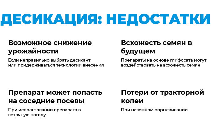 Неотъемлемая часть технологии выращивания - десикация сельскохозяйственных культур или химическая сушка (ускорение созревания путем уменьшения содержания влаги). Это позволяет провести уборку урожая в оптимальные сроки при неблагоприятных климатических условиях с наименьшими качественными и количественными потерями.